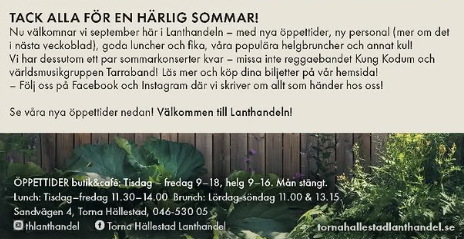 Måndagar stängt og nya öppettider restan av veckan .. men massor av aktivitet: Se kommande event på tornahallestadlanthandel.se/